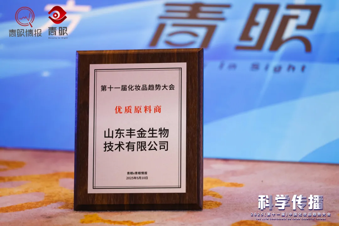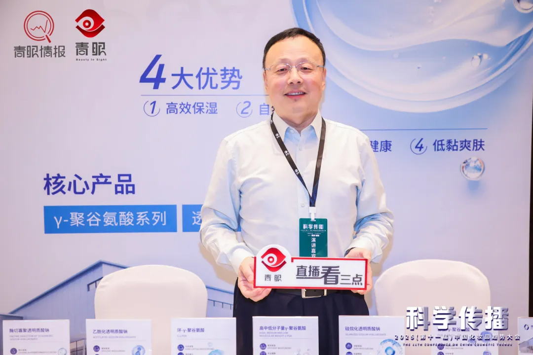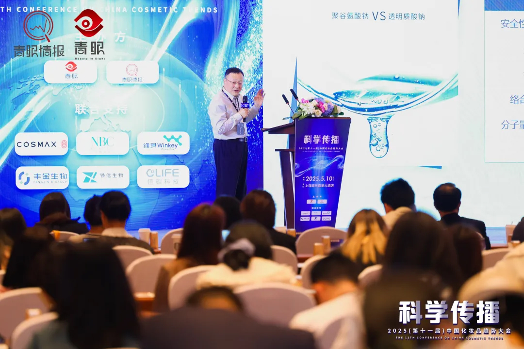 5月10日,2025(第十一屆)中國化妝品趨勢大會在上海盛大召開!本次活動由青眼、青眼情報主辦,以「科學傳播」為核心議題,行業領袖、科研先鋒齊聚一堂。山東豐金生物技術有限公司(以下簡稱豐金生物)作為聯合支持單位參與本次盛會,豐金生物董事長、總經理朱希強博士接受青眼會前專訪并受邀登臺演講,分享挑戰玻尿酸的「新」成分——聚谷氨酸鈉(PGA)的最新研發成果,精彩內容獲行業同仁贊譽。